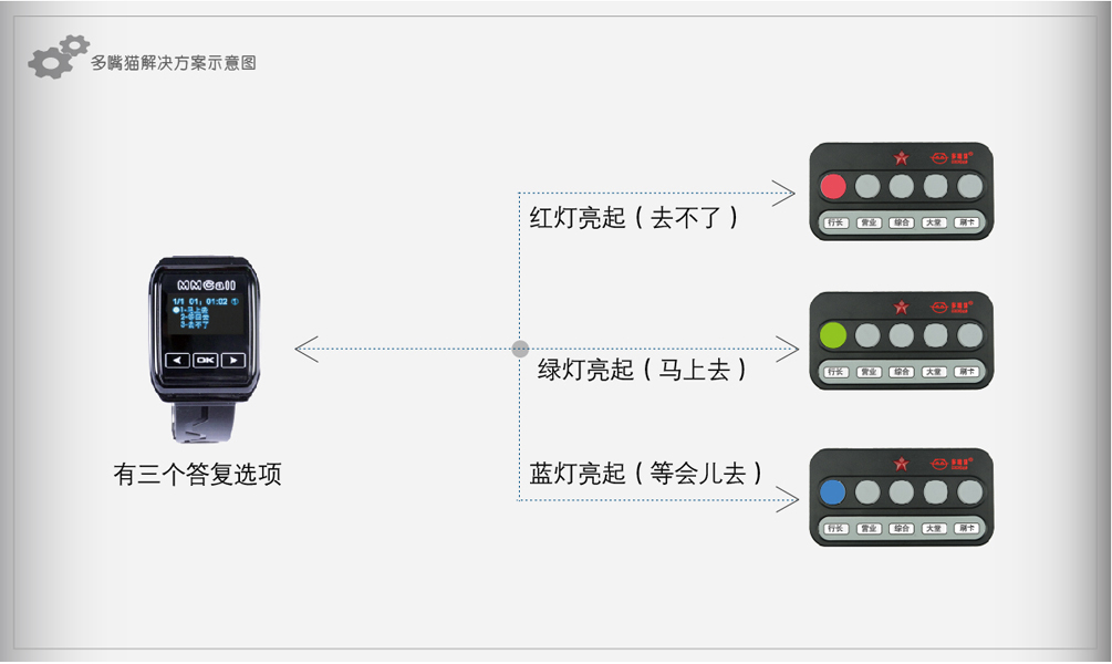 2、當被叫人員收到信息后,通過手表機上的選項進行確認,如:馬上去、去不了和過一會兒去等,確認信息經(jīng)由主機反饋給柜員呼叫器;