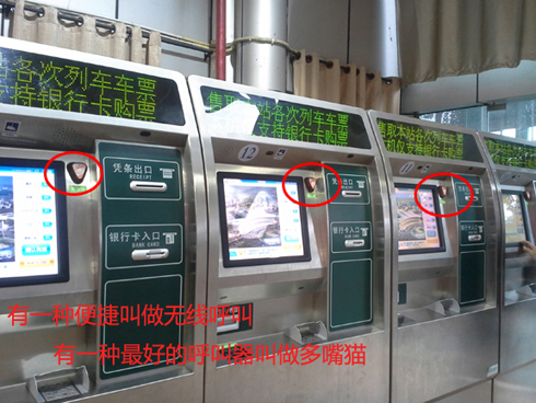 以重慶北站為例在重慶北站內(nèi)的全部互聯(lián)網(wǎng)自動(dòng)取票機(jī)安裝了多嘴貓呼叫器,用于旅客取票時(shí)遇到故障呼叫工作人員。