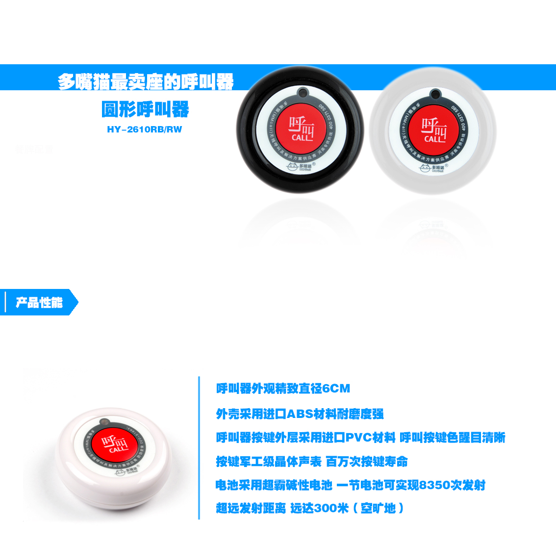HY-2610RB/RW系列是多嘴貓一款非常暢銷的經濟型無線呼叫器,外觀小巧精致,主要用于茶樓、棋牌室、足療、洗浴中心大廳等面積較小的場所。