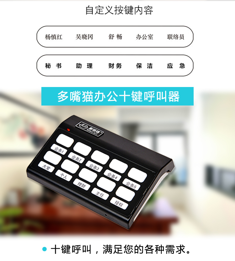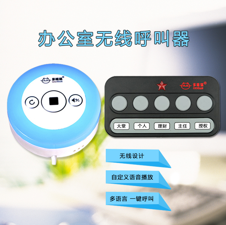 特點(diǎn):七種顏色感應(yīng)燈 不同領(lǐng)導(dǎo)呼叫可以顯示不同顏色 可以接收多個(gè)領(lǐng)導(dǎo)呼叫 外觀小巧 USB充電 不占地 可平放 實(shí)用又美觀 自定義錄制語(yǔ)音 中文 英文 西班牙語(yǔ)都可以 語(yǔ)音自定義 想說(shuō)什么 您說(shuō)了算 接收模式設(shè)置 離開(kāi)座位期間如有呼叫 接收燈會(huì)亮 看到后 按下重播鍵即可收到呼叫 音量大小可調(diào)