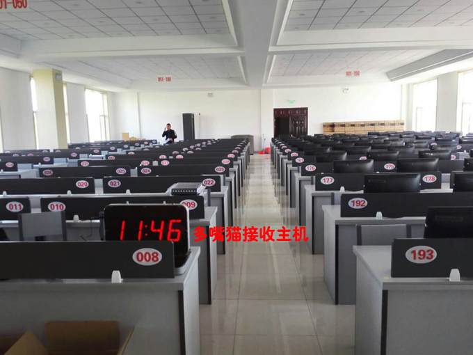 在考場內(nèi)的每張桌子上都安裝了一個多嘴貓無線呼叫器,當(dāng)考生在考試過程中,有任何問題,按一下多嘴貓無線呼叫器,就可以發(fā)出呼叫信息,在考場上方懸掛的大屏幕上就會顯示出呼叫號碼,監(jiān)考老師可以通過顯示屏及時處理每個呼叫。