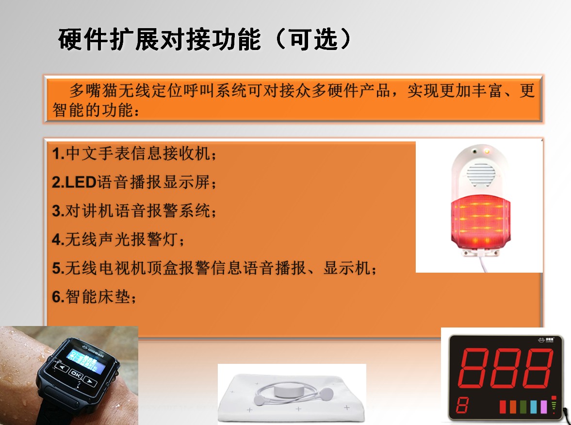 系統(tǒng)擴(kuò)展性強(qiáng)(定制軟件功能、手表接收報(bào)警信息、監(jiān)控?cái)z像和警燈聯(lián)動(dòng)及家屬APP報(bào)表等)