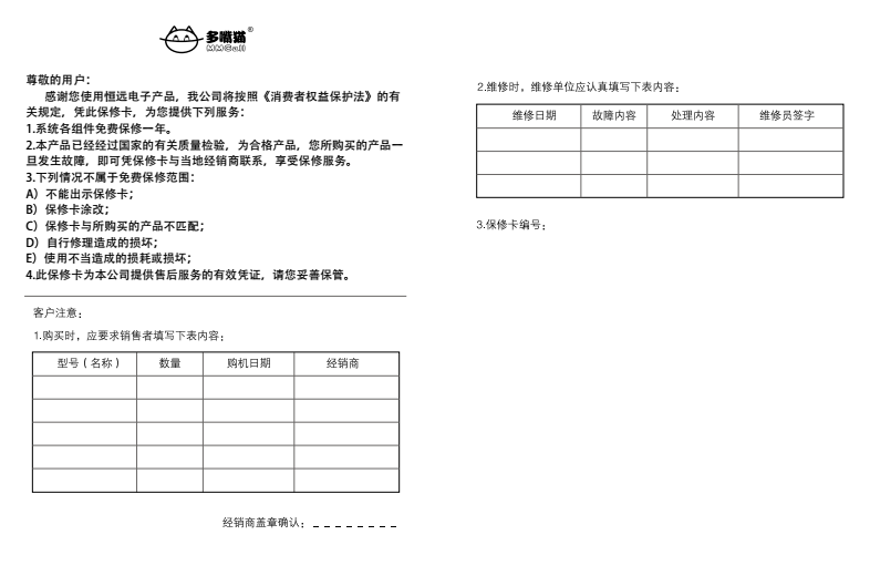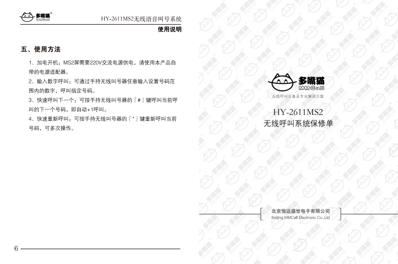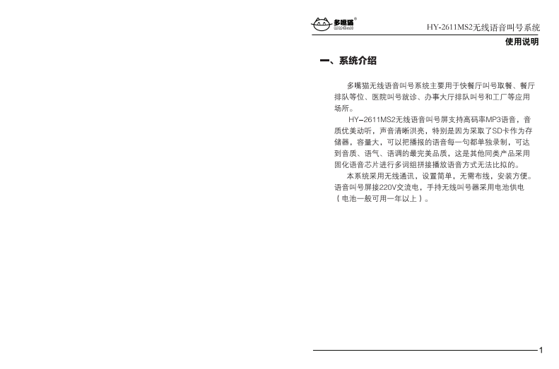 多嘴貓”HY2611T型餐飲無(wú)線呼叫服務(wù)系統(tǒng)說(shuō)明書(shū)