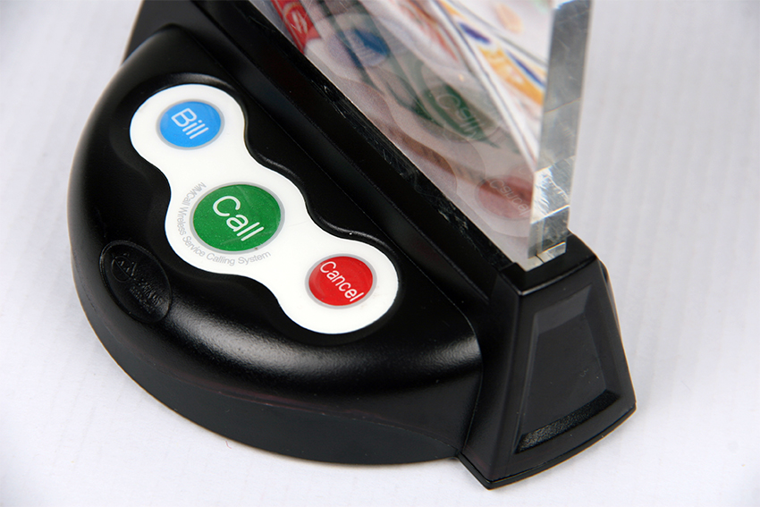 多嘴貓推出半圓形餐牌三鍵調(diào)頻呼叫器,全聚德、眉州東坡等著名餐飲企業(yè)的選擇。高檔紫褐色半透明PC料外殼,三色600流明的提示燈,雙層臺(tái)灣進(jìn)口4毫米磁吸亞克力餐盤或8毫米半圓可激光雕刻亞克力餐盤。