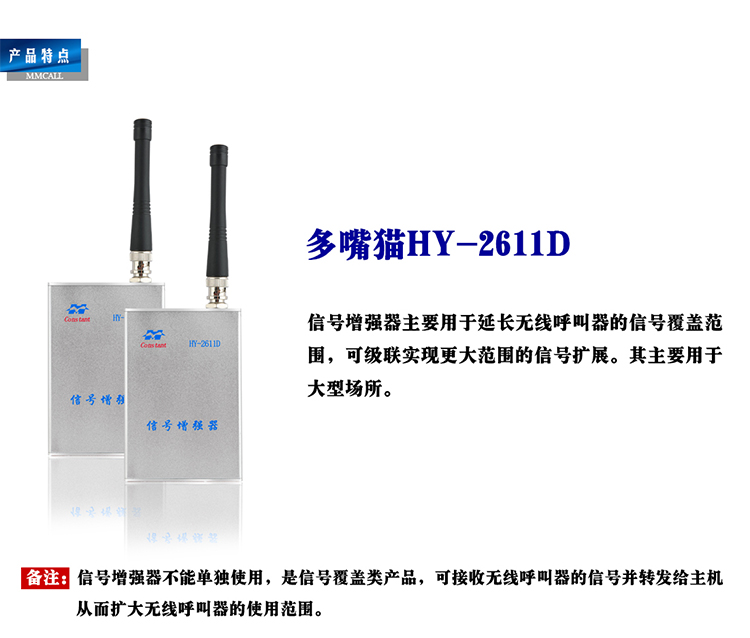 特點:信號增強器主要用于延長無線呼叫器的信號覆蓋范圍,可級聯(lián)實現(xiàn)更大范圍的信號擴展。其主要應用于大型場所。