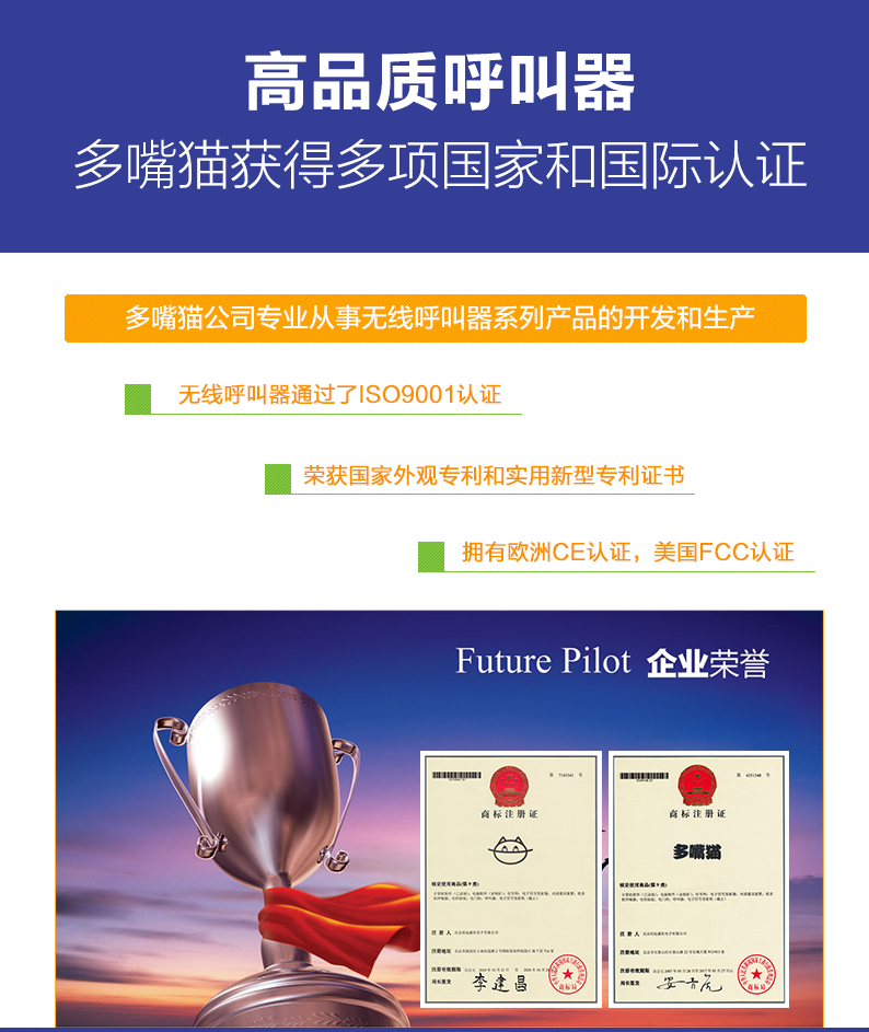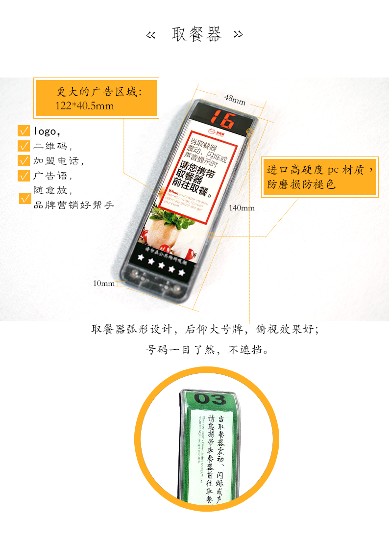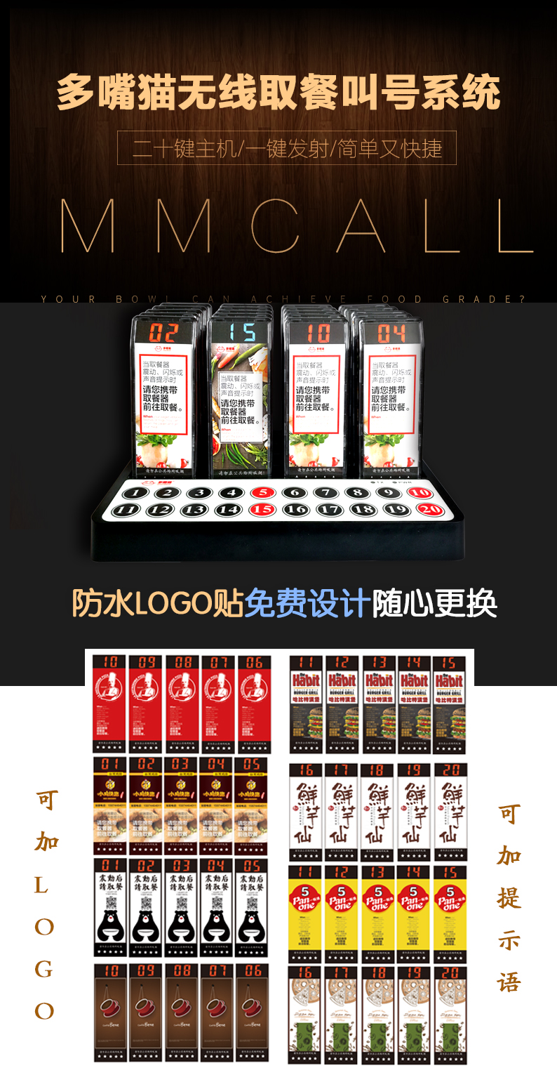 特點:多嘴貓經濟型無線取餐呼叫系統(tǒng),產品信號覆蓋距離遠,取餐呼叫器設計新穎,適合中小餐飲、娛樂等服務場所。