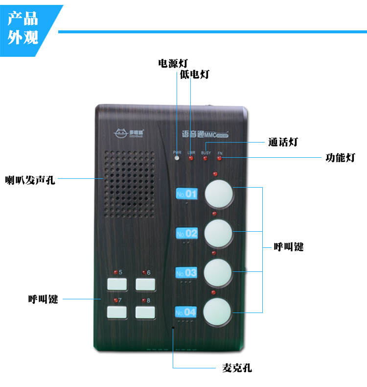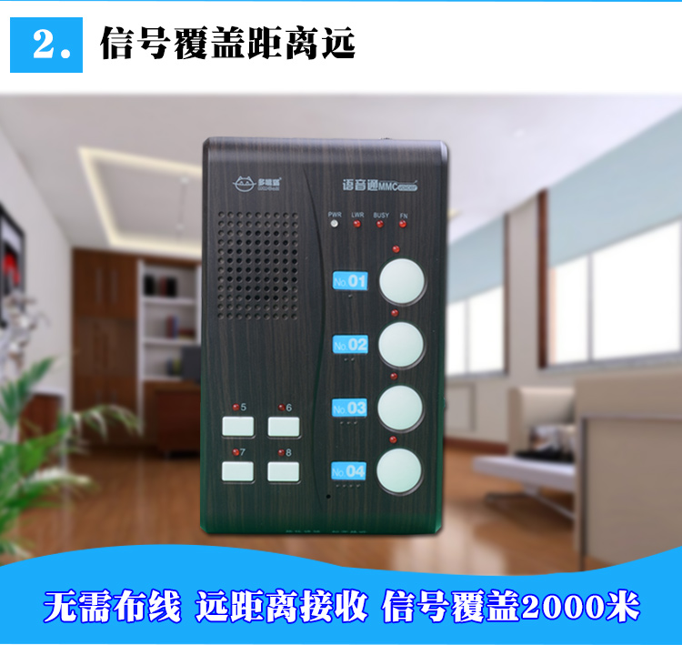 特點:通話清晰,音量可調(diào),內(nèi)置進口語音芯片,通話清晰,避免干擾,操作簡單。一鍵通話,按住就可以講話,無需撥號,無需等待。距離遠,無線信號強,標(biāo)準(zhǔn)版可覆蓋1-5層樓,遠距離款可覆蓋8層樓。