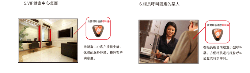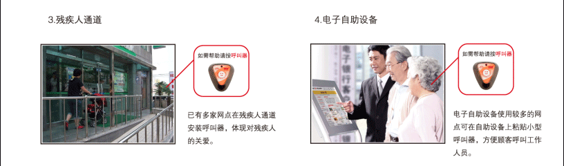 方案二:銀行服務(wù)無線呼叫解決方案:【自助取款設(shè)備、單據(jù)填寫處、VIP財務(wù)中心、無障礙通道、愛心座位等位置的幫助呼叫。】