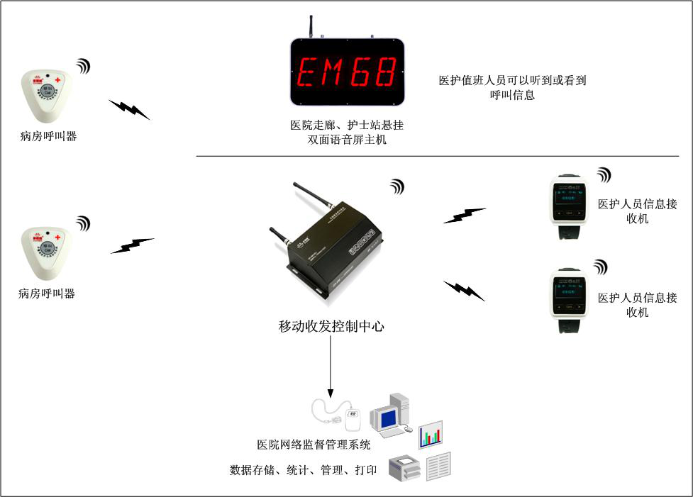 ? 使用說明:在各病房的病床床頭處安裝多嘴貓醫(yī)護(hù)呼叫器、當(dāng)病人需要找護(hù)士時,只需要按一下呼叫器,呼叫信息發(fā)送至病區(qū)走廊或者護(hù)士站內(nèi)的語音雙面屏主機(jī),這款主機(jī)外觀大,顯示字體大而清晰、呼叫器容量大、接收到呼叫信息后有語音報號提示或者音樂提示,是醫(yī)院的最佳選擇。同時可以選配多嘴貓移動系統(tǒng),可以同時將病人的呼叫通過移動控制中心轉(zhuǎn)發(fā)至中文手表式接收機(jī),護(hù)士隨時隨地可以接收到病人的呼叫,更加方便快捷。