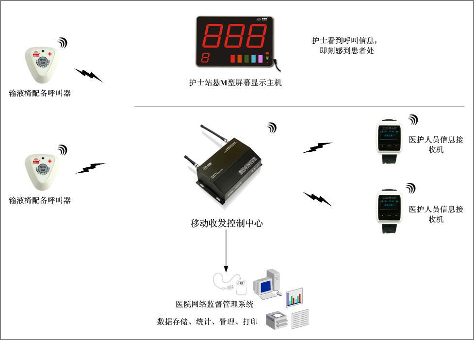 ? 使用說明:在每張輸液椅上安裝多嘴貓呼叫器,病人可以通過呼叫器呼叫護(hù)士換液、拔針等。推薦使用移動接收系統(tǒng),呼叫信息可以通過移動控制中心轉(zhuǎn)發(fā)至中文手表接收機(jī)內(nèi),護(hù)士使用接收方便,工作效率有效提升。