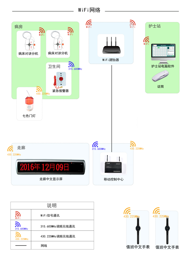 護(hù)士工作站(電腦、軟件和外界聽(tīng)筒)和病房對(duì)講分機(jī)利用Wi-Fi網(wǎng)絡(luò)進(jìn)行語(yǔ)音傳輸;移動(dòng)控制中心CA主機(jī)、中文手表信息機(jī)、衛(wèi)生間拉繩緊急報(bào)警器、病房7色無(wú)線門(mén)燈、信號(hào)增強(qiáng)器、走廊雙面無(wú)線顯示屏采用315.600MHz和430.225MHz調(diào)頻微功率無(wú)線數(shù)據(jù)通訊。
