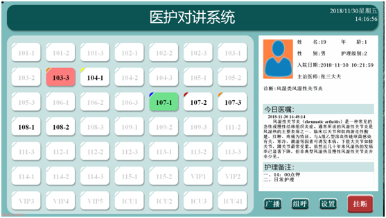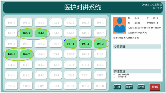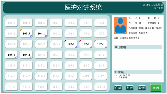 當(dāng)醫(yī)護(hù)主機(jī)接收到呼叫時(shí),對(duì)應(yīng)分機(jī)的按鈕會(huì)自動(dòng)變色(紅色),當(dāng)接聽(tīng)對(duì)講后變?yōu)榫G色,結(jié)束通話后變?yōu)榛野咨?,護(hù)士可對(duì)所轄病區(qū)的每個(gè)病床呼叫狀態(tài)一目了然,方便管理。