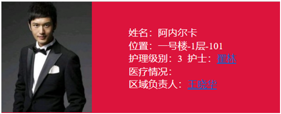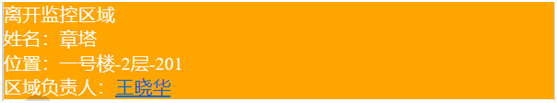 這個功能是用來監(jiān)視老人是否離開了指定區(qū)域,比如老人因為某種原因住進了特護房間,醫(yī)生不允許老人離開這個房間的,一旦老人離開就會發(fā)出報警信息,中心軟件上會顯示橙色報警信息,如下圖所示,并發(fā)出報警聲音,同時護士佩戴的手表信息機上也會收到報警信息。