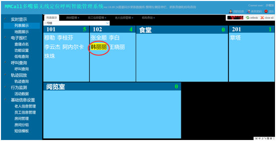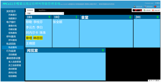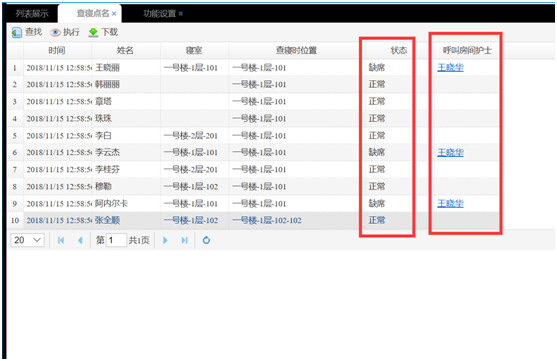 設(shè)置一個時間段,比如晚上9點到早上6點,然后查詢,會顯示出老人是否在自己的房間,如下圖所示。如果有人缺席,點擊【呼叫房間護士】按鈕,就會發(fā)送信息給護士,護士會判斷是否需要到房間查看。