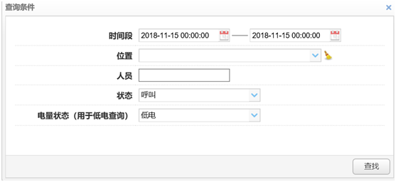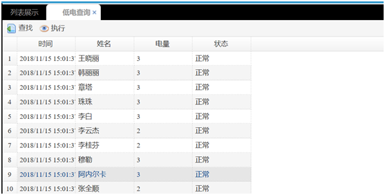 如果想查詢所有腕表式定位呼叫器的電量狀態(tài),可以在低電查詢里查詢,輸入查詢條件,然后以列表的形式顯示各個腕表式定位呼叫器的電量狀態(tài)。