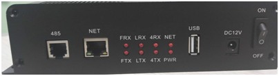 船型開關(guān)、DC12V電源插座、指示燈(電源指示(Pwr)、網(wǎng)絡(luò)燈(Net)、315M解碼燈(FTX FRX)、擴頻發(fā)射和接收燈(LTX LRX),RS485通訊燈(4TX 4RX)、LAN網(wǎng)口、RJ11-6- 485口 |