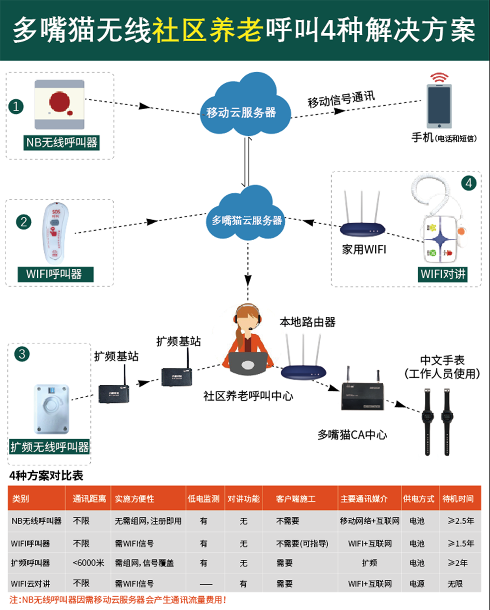 社區(qū)養(yǎng)老老人居住比較分散,呼叫距離遠(yuǎn),采用有線通信方式耗時(shí)耗力成本高昂,無(wú)線通訊是最佳選擇。另外,社區(qū)緊急呼叫設(shè)備要確保使用方便,維護(hù)簡(jiǎn)單,呼叫器待機(jī)時(shí)間長(zhǎng)等特點(diǎn)。多嘴貓根據(jù)不同需求,提供多種社區(qū)養(yǎng)老無(wú)線呼叫解決方案,有短信息呼叫也有語(yǔ)音對(duì)講系統(tǒng),有適合小范圍的自建無(wú)線網(wǎng)絡(luò),也有距離不限的結(jié)合移動(dòng)通訊和互聯(lián)網(wǎng)技術(shù)的解決方案。