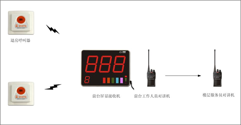 退房呼叫器采用調(diào)頻無線技術(shù)(無需布線,不破壞裝修)安裝在房卡插座旁邊,在客人離開時,按一下退房呼叫器的按鈕,樓層服務員隨身攜帶的數(shù)字信息機就可以收到信息,立即開始查房,在客人到達總臺之前,服務員就可以通過房間電話向總臺確認查房完畢,為酒店的查房操作節(jié)省大量時間,由原來的十幾分鐘降至兩三分鐘,極大地提高了星級酒店的服務質(zhì)量和形象。