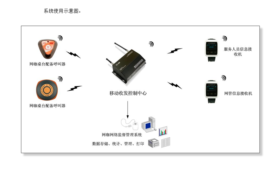 ?使用說明:在每個座位上安裝多嘴貓無線呼叫器,客人在休閑娛樂過程中,可以通過按多嘴貓呼叫服務(wù)員或者網(wǎng)管。呼叫信號通過CJ型控制中心發(fā)送至網(wǎng)管或者服務(wù)員隨身佩戴的中文手表接收機,服務(wù)員通過中文信息機上顯示的座位號碼,為客人提供服務(wù)。