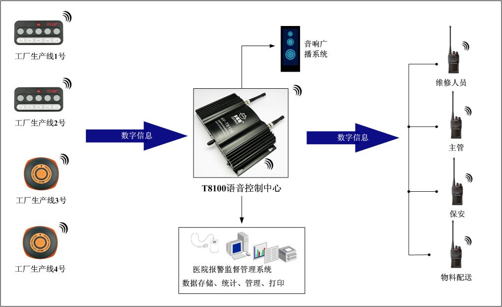 無(wú)線呼叫器在工廠,尤其是生產(chǎn)線的應(yīng)用越來(lái)越廣泛,在很多工廠的工作人員經(jīng)常是隨身攜帶兩種設(shè)備——對(duì)講機(jī)和手表式無(wú)線信息接收機(jī)(用于接收無(wú)線呼叫器信號(hào)的專用設(shè)備)。既增加成本又不方便,針對(duì)這一問題,多嘴貓率先推出專利產(chǎn)品:HY-T8100無(wú)線呼叫對(duì)講通訊系統(tǒng)。HY-8100是無(wú)線呼叫器系統(tǒng)的第三代產(chǎn)品,創(chuàng)造性地將調(diào)頻無(wú)線發(fā)射技術(shù)和語(yǔ)音技術(shù)相結(jié)合,真正實(shí)現(xiàn)語(yǔ)音呼叫。(第一代無(wú)線呼叫器采用條幅技術(shù)的模擬呼叫系統(tǒng),第二代是采用調(diào)頻技術(shù)的數(shù)字呼叫器系統(tǒng))。