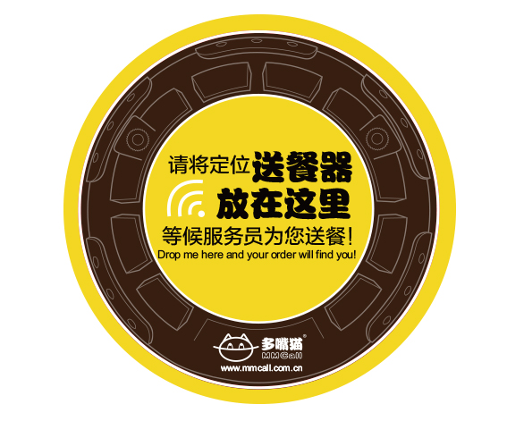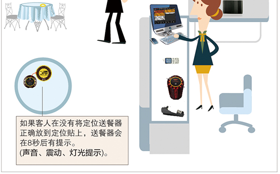 如果客人忘記把送餐器放置在指定的定位區(qū),并靜止超過(guò)10秒鐘,送餐器會(huì)自動(dòng)發(fā)出 “親,請(qǐng)把我放在指定位置好嗎?”這樣的語(yǔ)音提示,以提醒顧客把送餐器放到定位區(qū)。