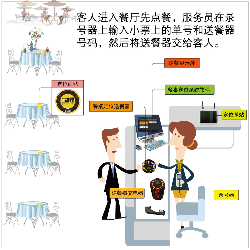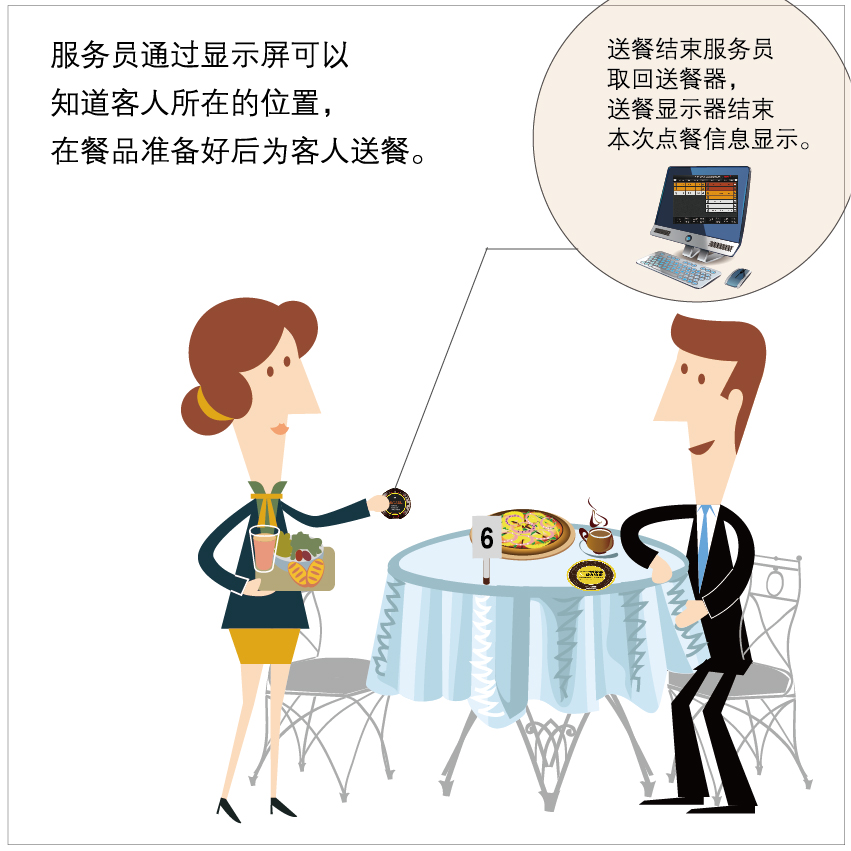 本系統(tǒng)適用于由服務(wù)員給客人送餐模式的餐廳,主要的特點(diǎn)是客人在前臺(tái)點(diǎn)餐后,自行找到任意座位就座,而當(dāng)菜品做好時(shí)服務(wù)員能準(zhǔn)確的找到顧客的位置,給客人送過(guò)去。 同時(shí),本系統(tǒng)也可以實(shí)現(xiàn)由出菜口通過(guò)無(wú)線(xiàn)呼叫客人來(lái)取餐,滿(mǎn)足了通知客人取餐和給客人送餐的兩種需求。