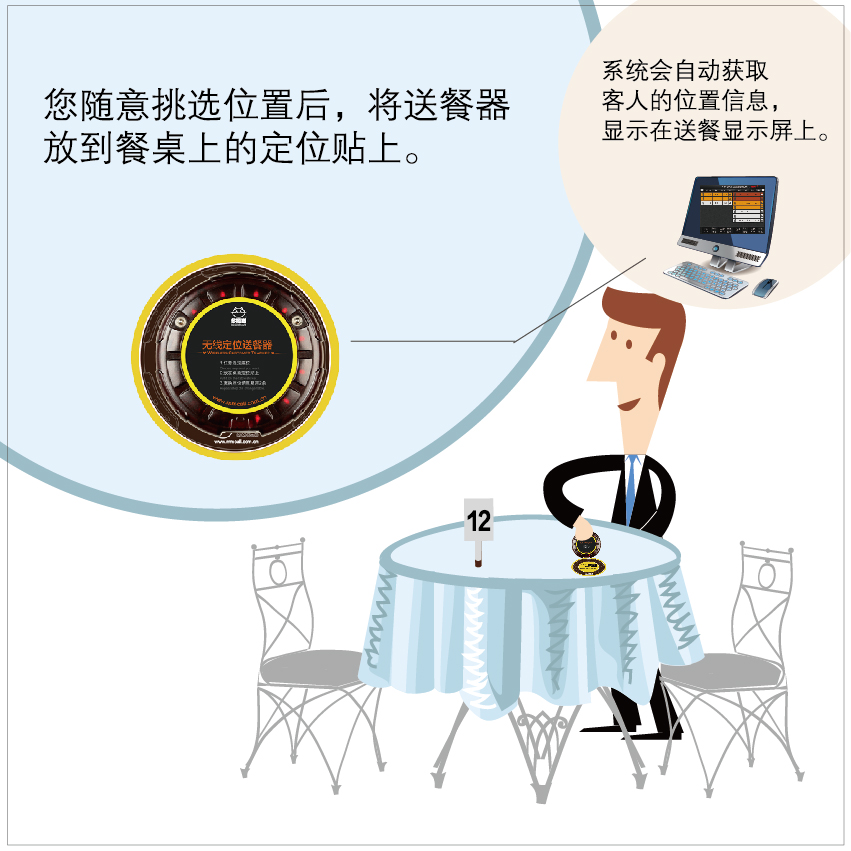 ◎ 3、當(dāng)顧客找到了空桌,把送餐器放置到定位標(biāo)簽指示的位置,送餐器開(kāi)始讀取桌子底下的定位ID卡,把桌號(hào)和設(shè)備號(hào)無(wú)線(xiàn)發(fā)送給定位基站,如下圖所示。
