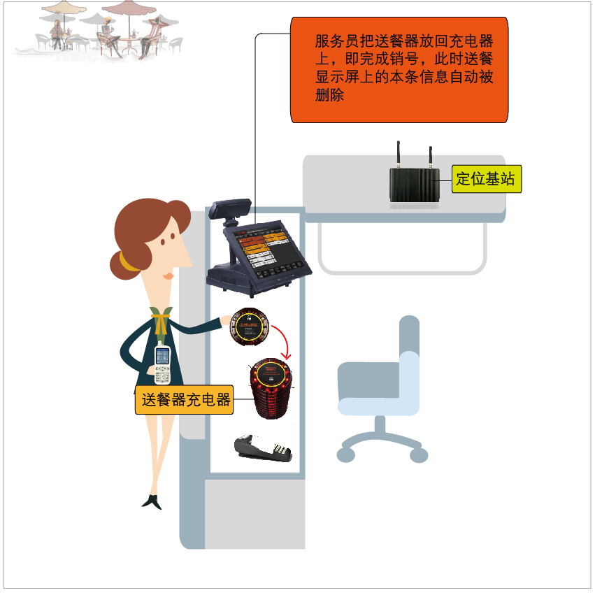 ◎ 6、服務(wù)員把送餐器放回充電器上,即完成銷(xiāo)號(hào),此時(shí)送餐顯示屏上的本條信息自動(dòng)被刪除